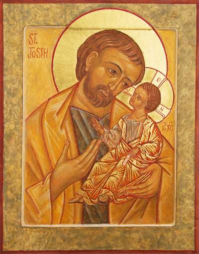 The icon of St Joseph and Child is in the Russian Tradition. Joseph holds Jesus in a manner reminiscent of the Icon of the Mother of God of Tenderness. In fact tenderness is the theme of this icon. Tenderness as espoused by Pope Francis – a masculine – gentle – tenderness that is at once protective, delighted, engaged and overflowing with love. This is my image of St Joseph and what inspired this icon.