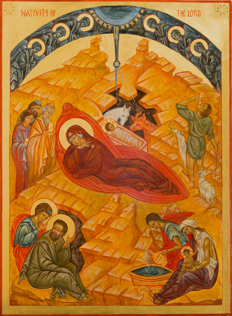 The Festal Icon of the Nativity depicts all the events in the Gospel narrative. The Mother of God is central and behind her is Jesus who was born in a cave that functions as a stable. Angels are above and the shepherds announce the birth. Jesus came as food for His people and to liberate the poor.
