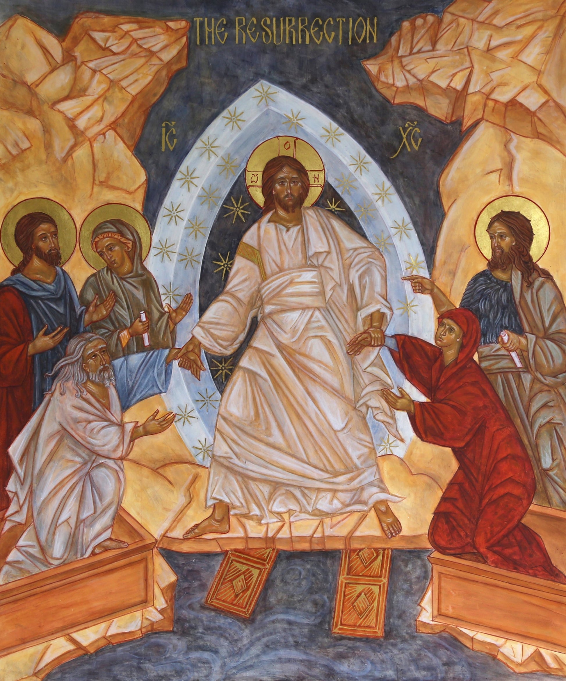 Resurrection (Anastasis in Greek) literally means “to stand up” or “rise again.” Jesus Christ (center), has risen from the dead in his glorified body and true identity as second person of the Holy Trinity. That he is part of the Godhead, Father, Son and Holy Spirit, is depicted by the blue, almond-shaped mandorla that surrounds him.