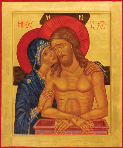 This pieta depicts Christ’s entombment as the Mother of God holds on to him. There is a tension between surrender and embrace, these movements occurring within the framework of the deep love and bond of mother and son. The Blessed Mother holds on to her only Son as he hands over his life for the salvation of the world. The icon is traditionally used in Holy Saturday liturgy and is offered for anyone who mourns the death of a loved one.